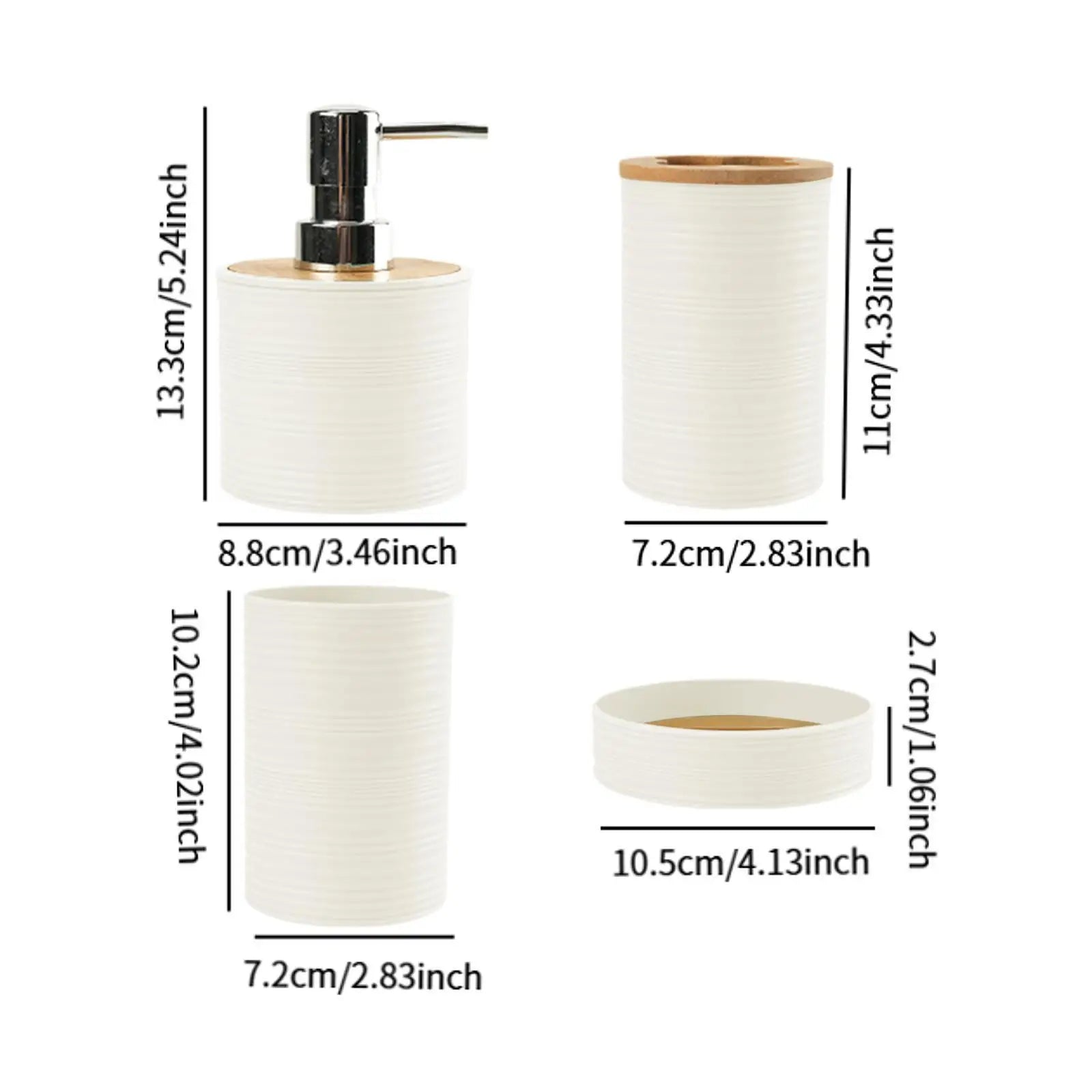 Ajoutez une touche de modernité à votre salle de bain avec cet ensemble de 4 accessoires pratiques. Fabriqué en matière PP solide et facile à nettoyer, ce set comprend un porte-brosse à dents avec couvercle, un gobelet pour brosses à dents, un distributeur de lotion et un porte-savon. Parfait pour une utilisation à la maison ou dans les hôtels, il gardera votre salle de bain organisée. Référez-vous au tableau des tailles pour des mesures précises.