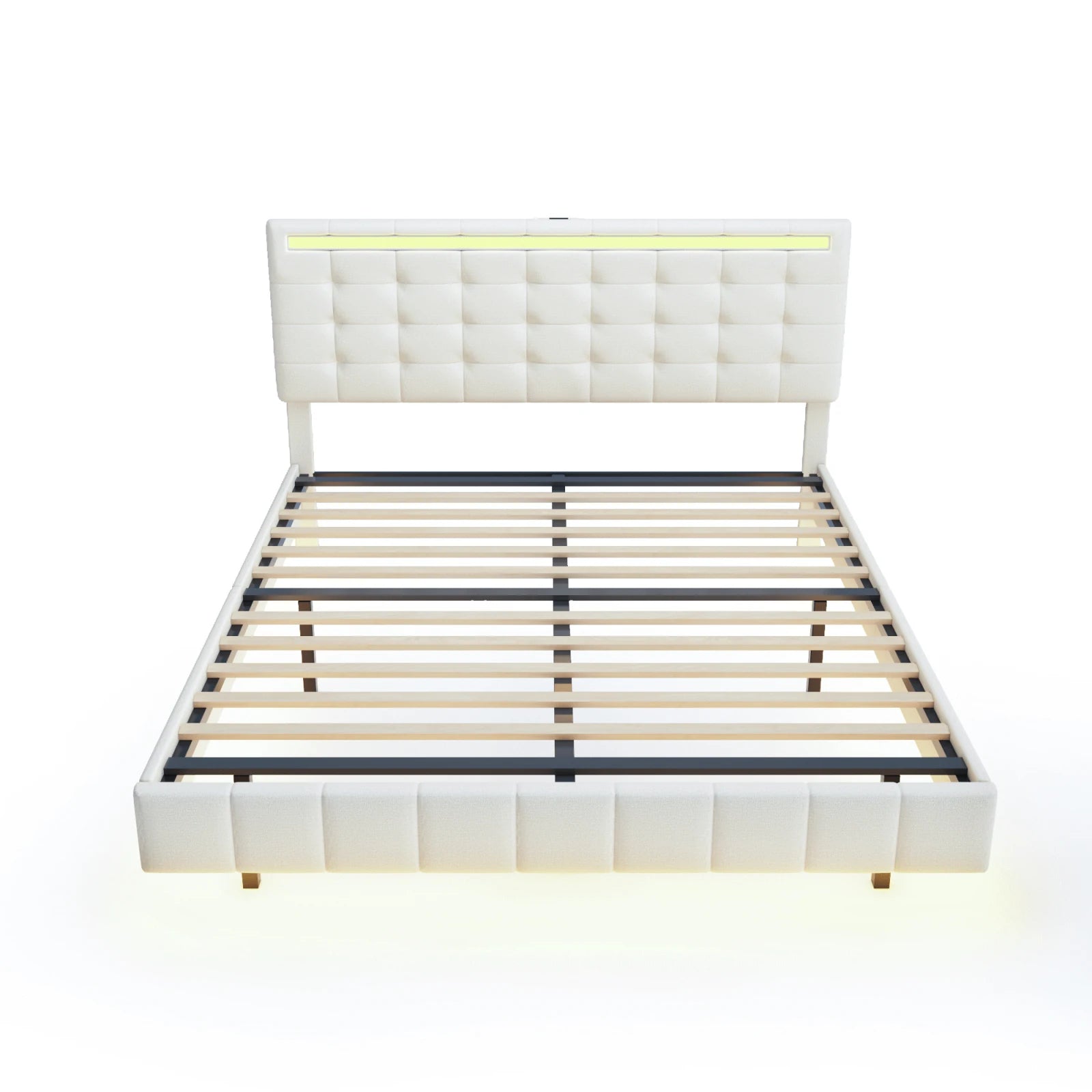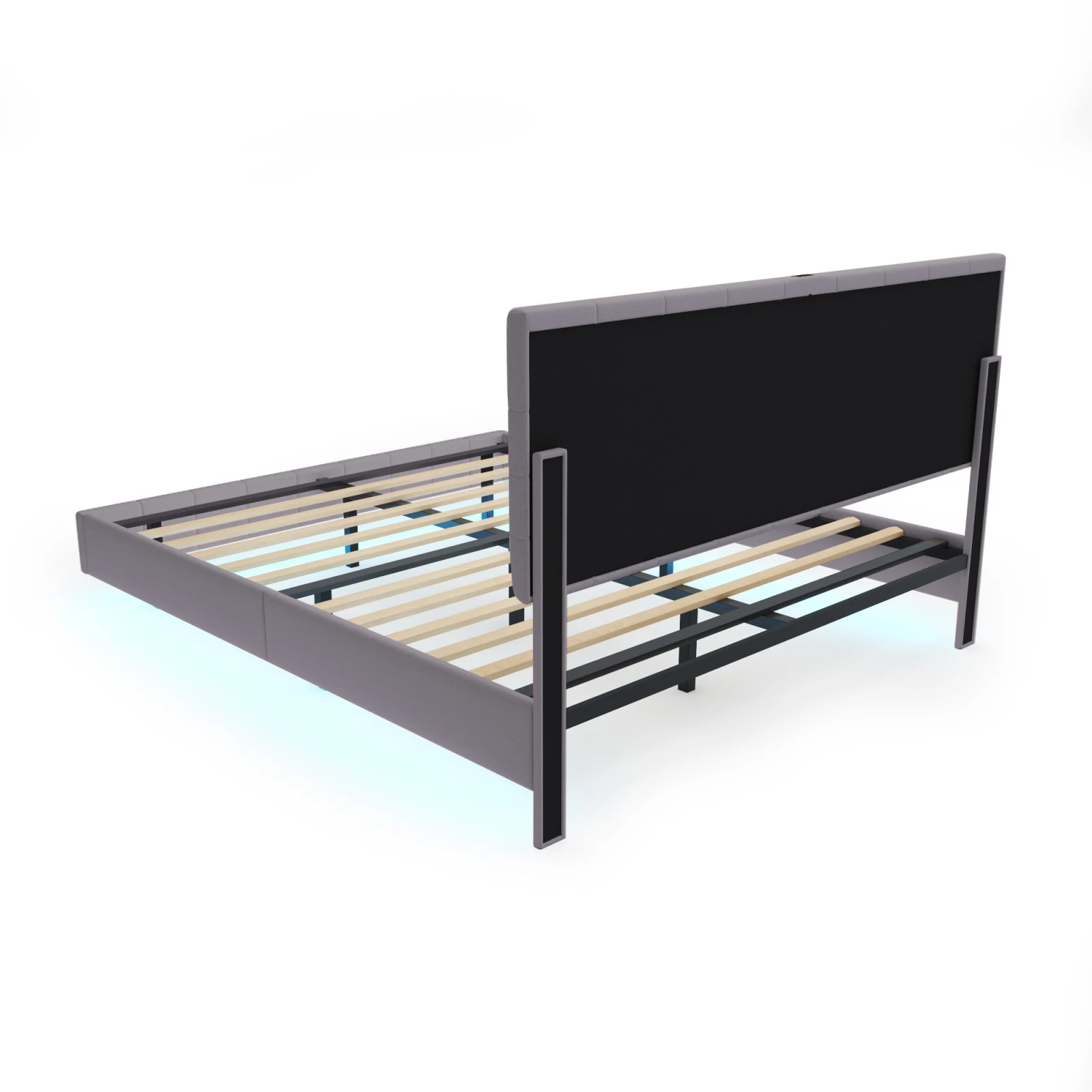 Lit double suspendu, effet velours avec sommier à lattes, 160x200cm, LED, port USB et haut parleurs intégré. Couleurs gris /beige.