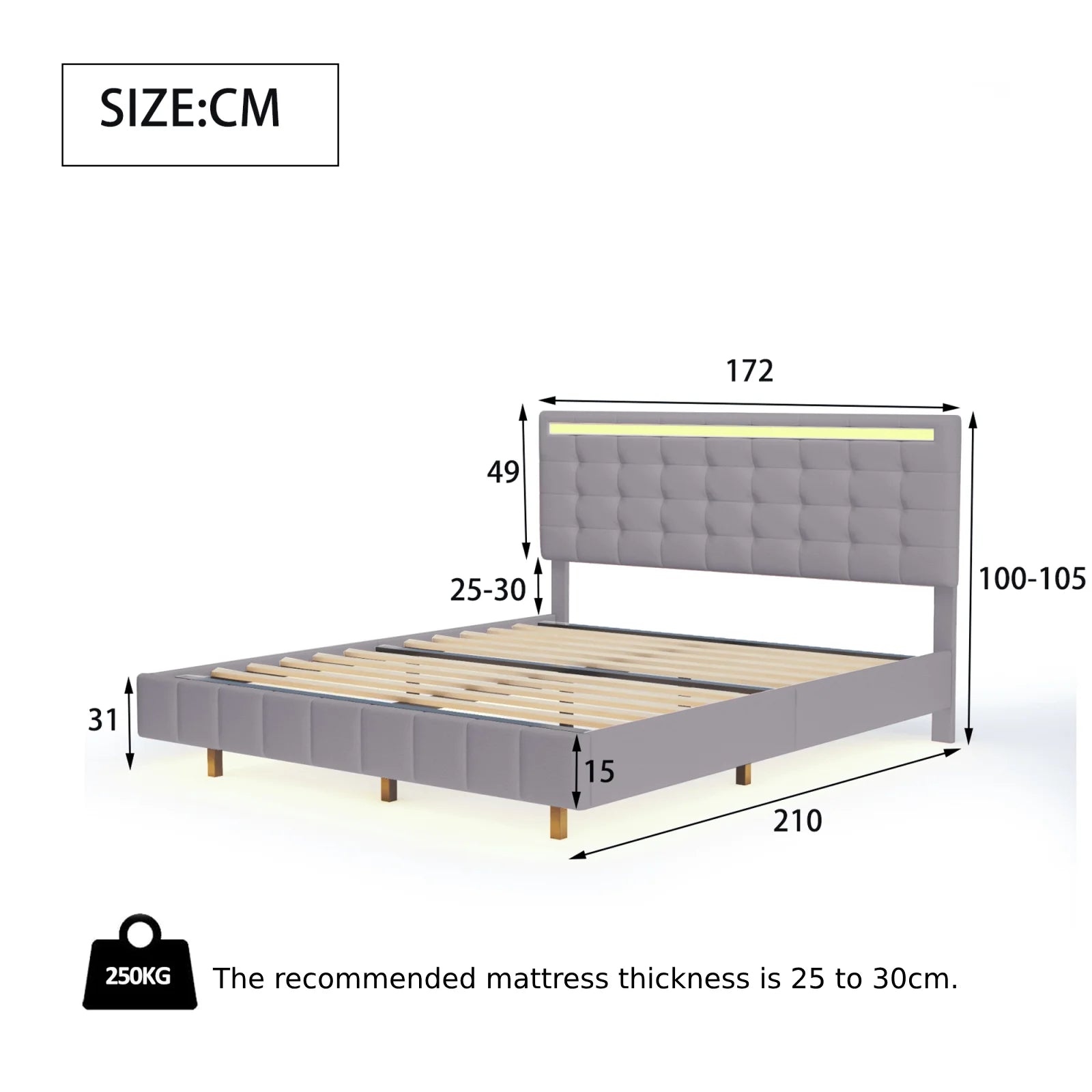 Le Lit double effet velours apportera une touche moderne à votre chambre à coucher. Fabriqué avec un tissu en chanvre, il offre un confort optimal. Avec son design élégant, ses LED, ainsi que port USB et son haut parleurs intégrés, il vous permet de créer une ambiance agréable pour vos nuits. Disponible en gris ou beige et facile à monter, il est parfait pour tout style d'intérieur. Dimensions 160 x 200cm. Offrez-vous une chambre moderne avec notre lit double effet velours ! Avec son design unique de bande lumineuse LED, contrôlée par une télécommande à 24 boutons, vous profiterez de 4 modes de changement automatique et de 16 couleurs différentes. Sa construction robuste en MDF et en métal assure une stabilité sans pareil.