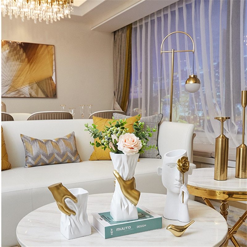 The Vase décoratif créatif gold and white is made with high-quality résine material, crafted through a specialized production process and designed as an elegant addition to any home decor. Its unique suspended shape and European style add a touch of sophistication to any room.