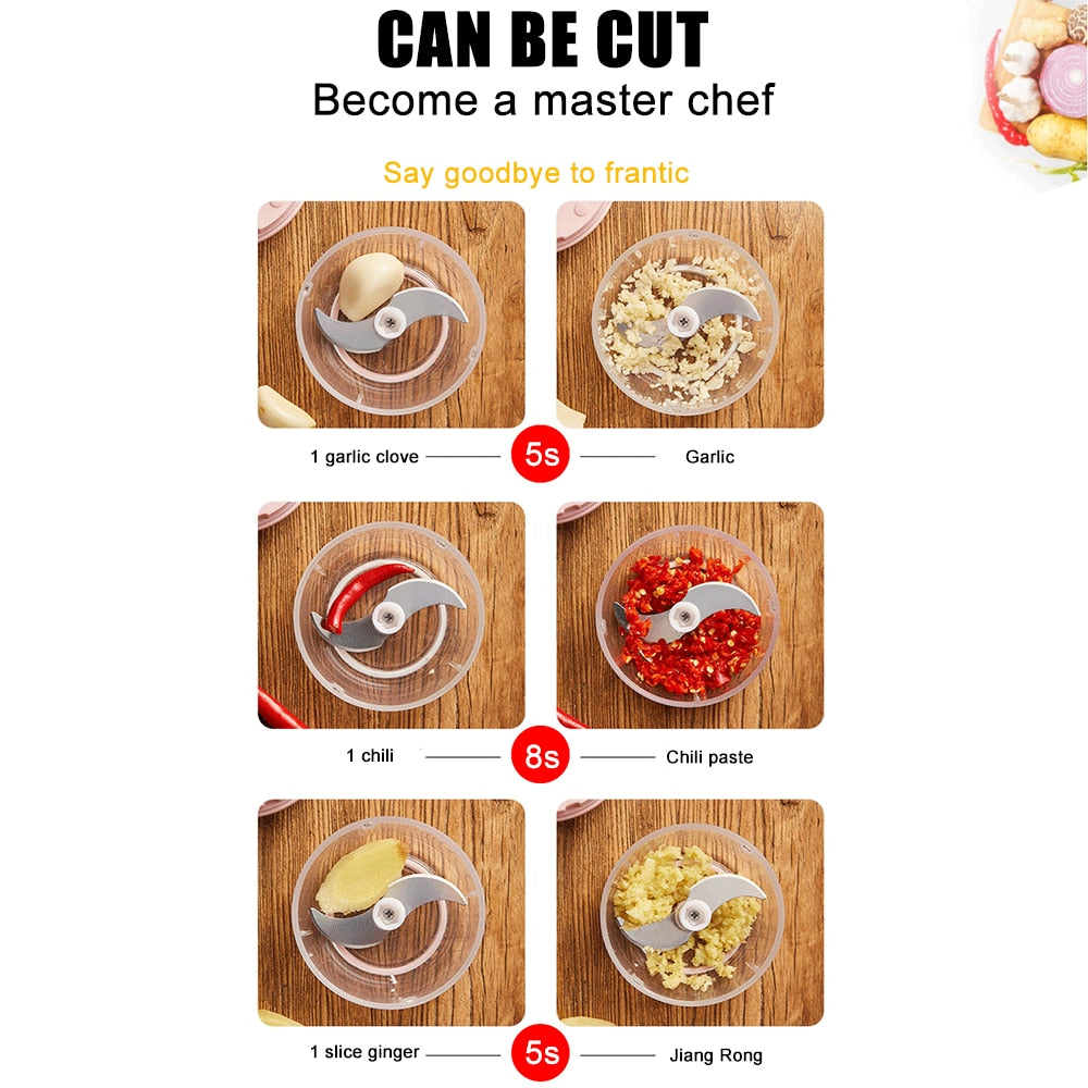 1.250ml, with 2 sharp blades, can chop garlic, ginger, pepper, vegetables, fruits, meat, etc. With electric function, you can save time and free your hands. The small shredder is also easy to store.