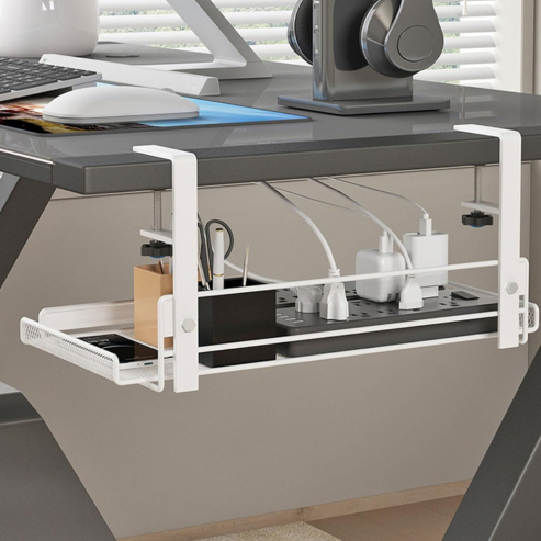 Simplify cable management with this non-invasive, steel organizer that easily slides under any desk. Constructed from sturdy steel, it effectively groups and conceals your cables, power strips, and chargers while maintaining the aesthetic of your workspace.