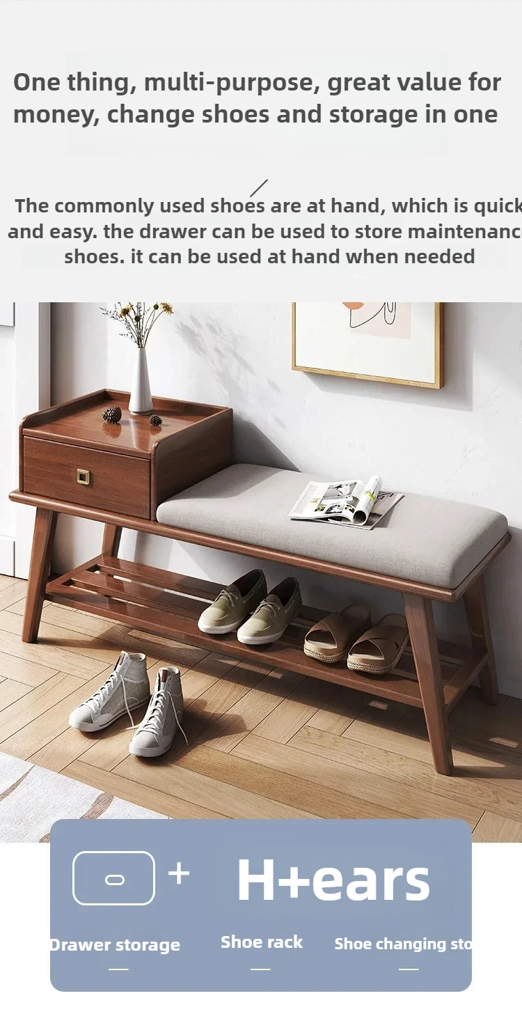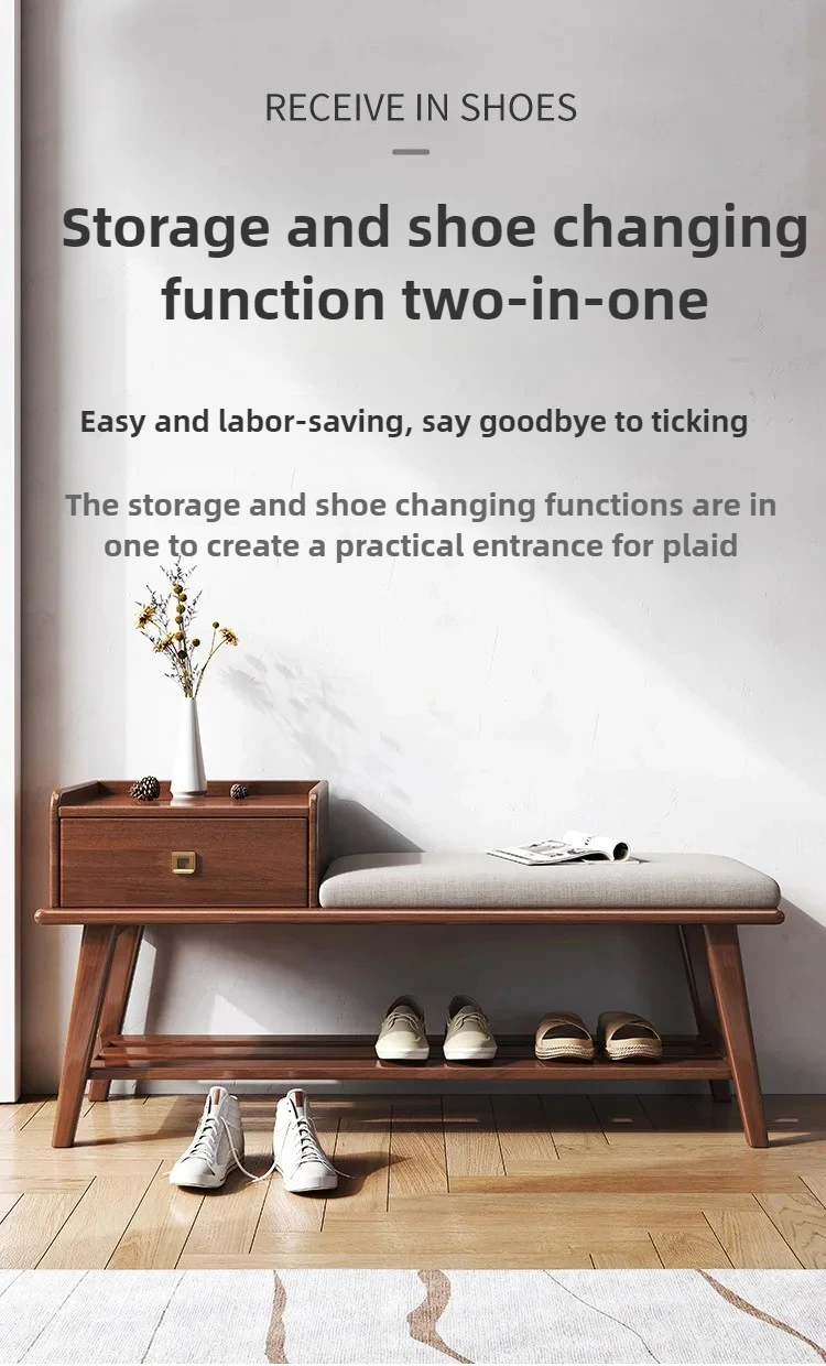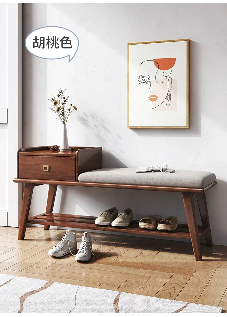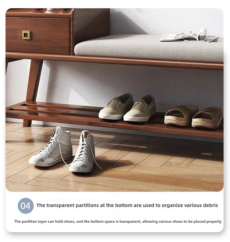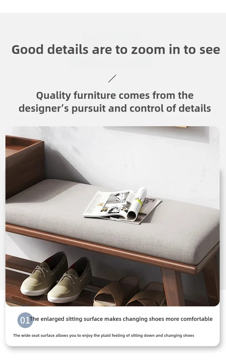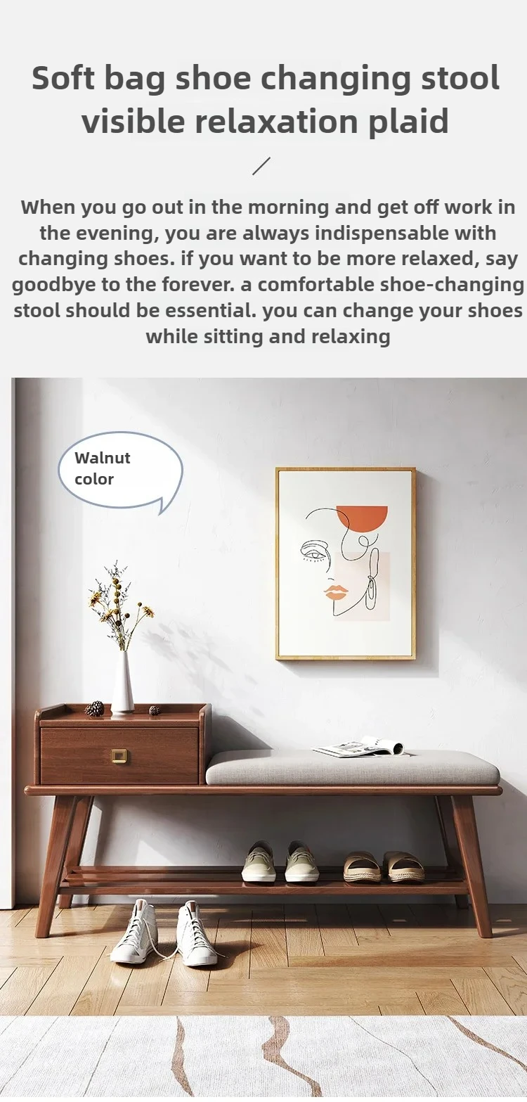 Description: This solid wood shoe storage cabinet with an integrated bench from NoEnName_Null is the perfect addition to any home. Expertly crafted and measuring 113x40x22, it offers a retro nostalgia and vintage feel. Its genuine leather material makes it durable and suitable for home decor, without the use of any highly concerned chemicals. Assembly is required for this customisable piece of living room furniture, model number HJL01 shoe changing stool # walnut, originating from mainland China and featuring a walnut pattern. This multi-functional piece can be used as a home stool and ottoman.