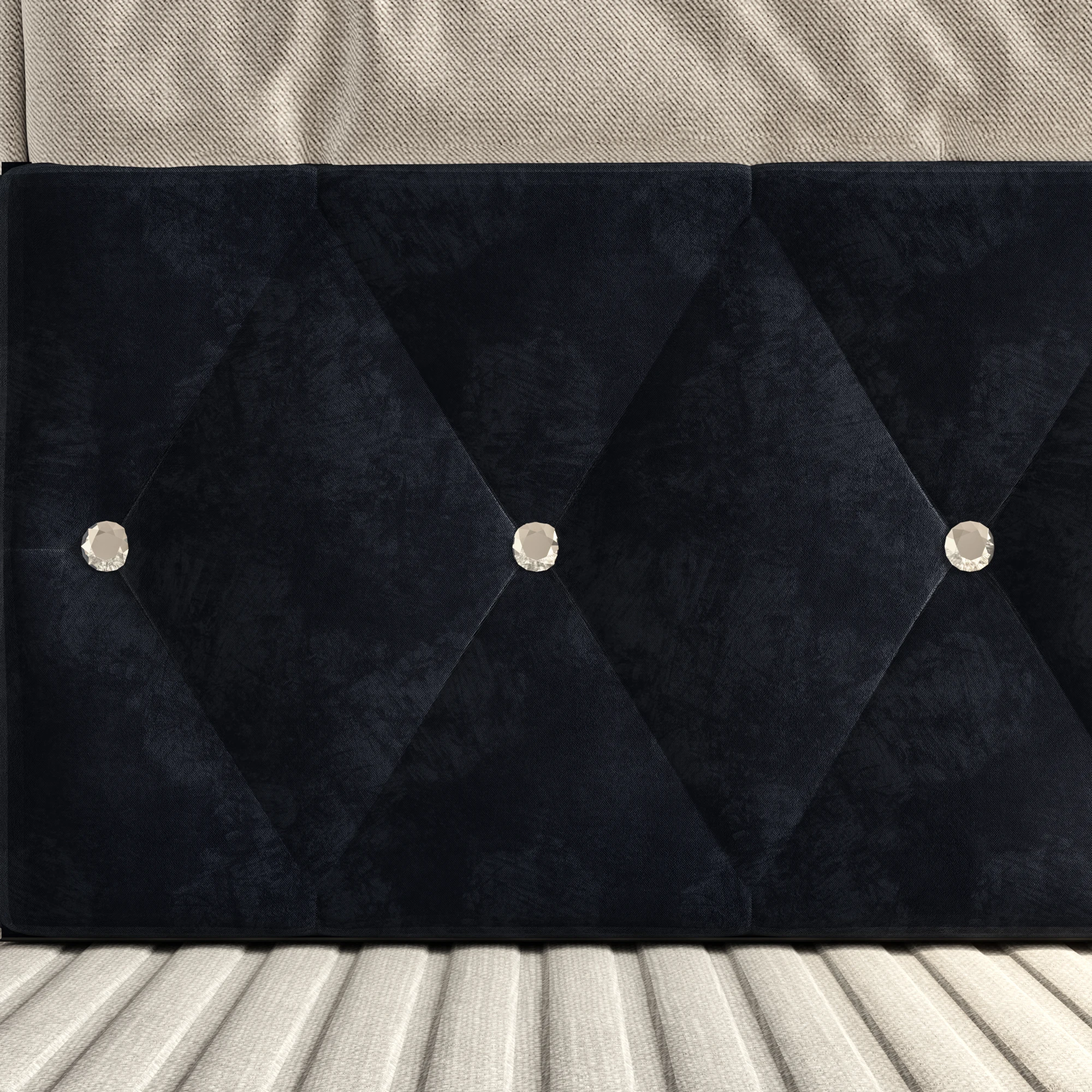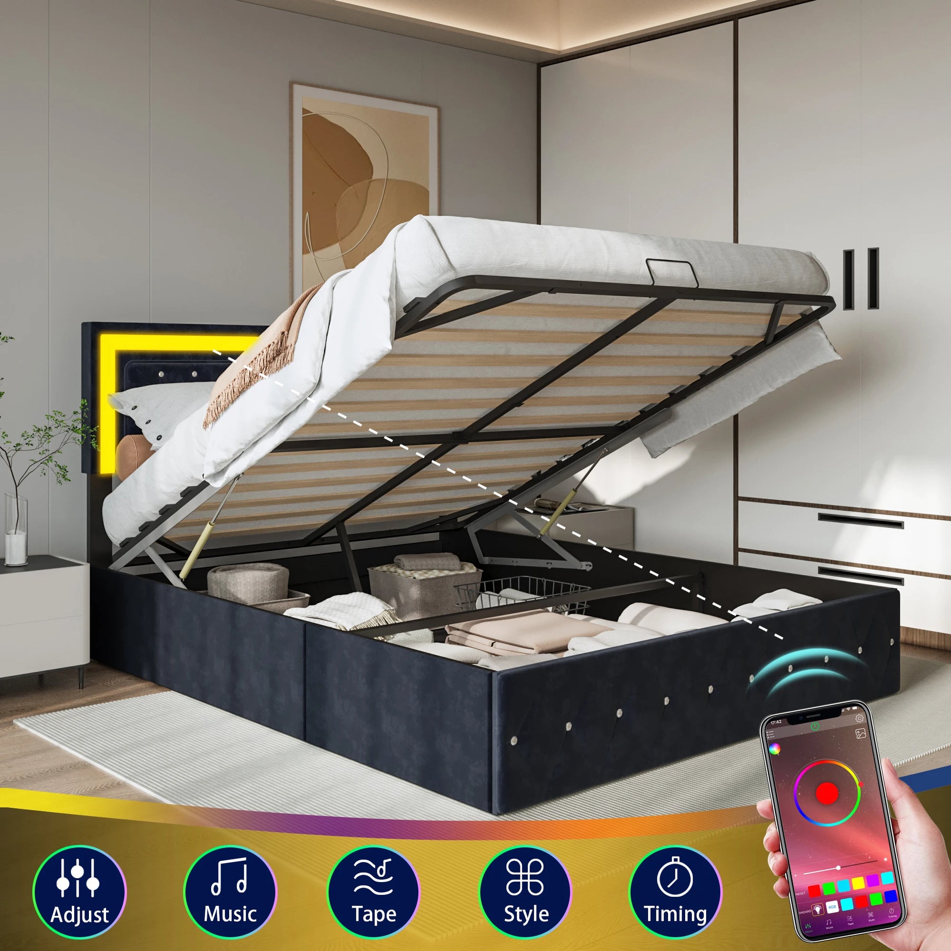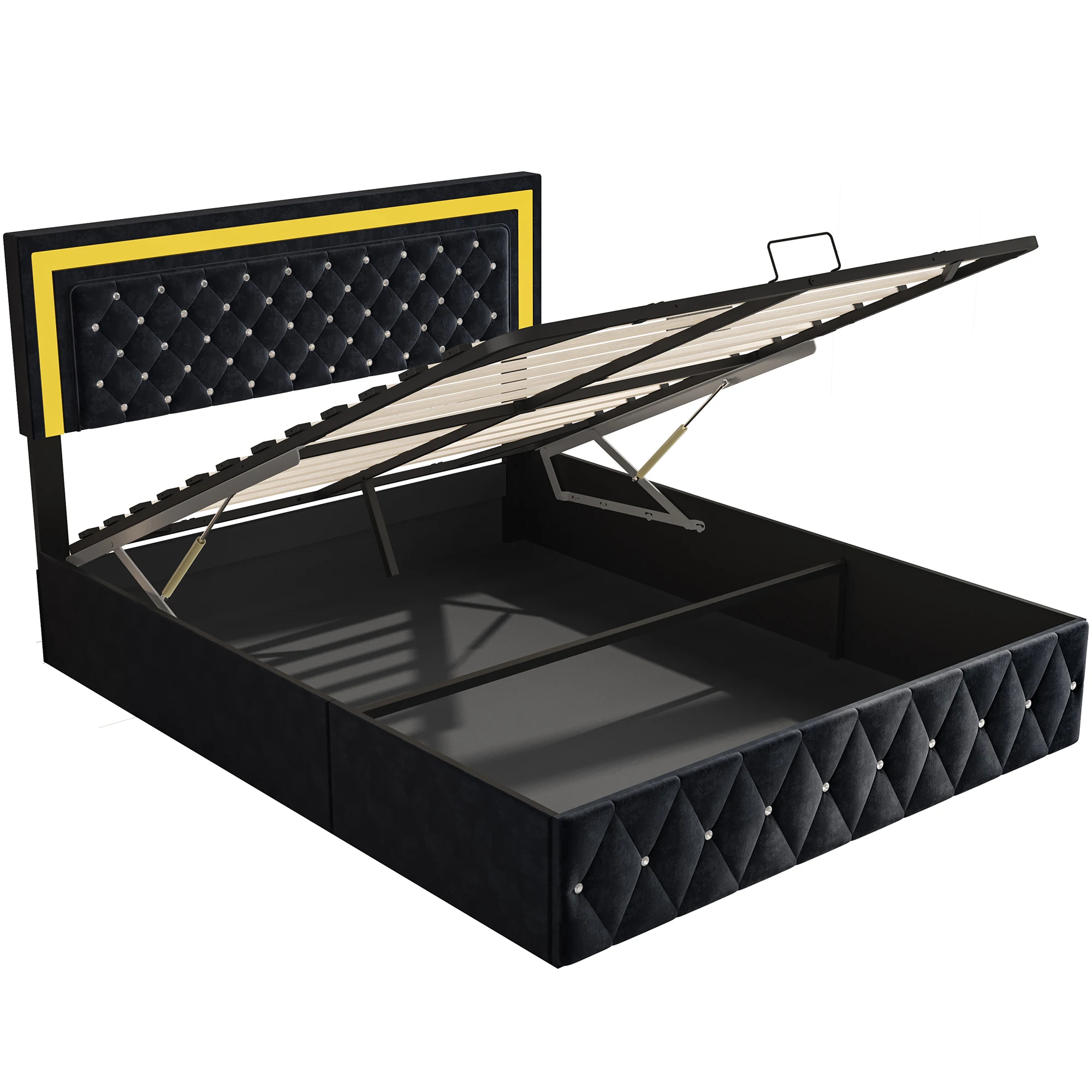 Lit coffre noir 140x200 cm avec LED, port USB et hauts parleurs intégrés.